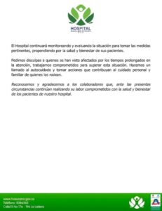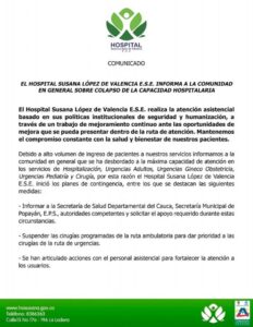 Mediante un comunicado a la opinión pública dado a conocer en su página de Facebook, directivos del Hospital Susana López de Valencia notificaron los ciudadanos, así como a las autoridades sanitarias, que su capacidad de atención ha sido superada por la alta demanda de varios de los servicios.