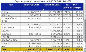 China se consolidó como principal destino, absorbiendo 61,6 % del volumen exportado (18.769 toneladas). Le siguen Rusia (11,8 %), Argelia (11,3 %), Chile (5,2 %) y El Salvador (4,2 %).